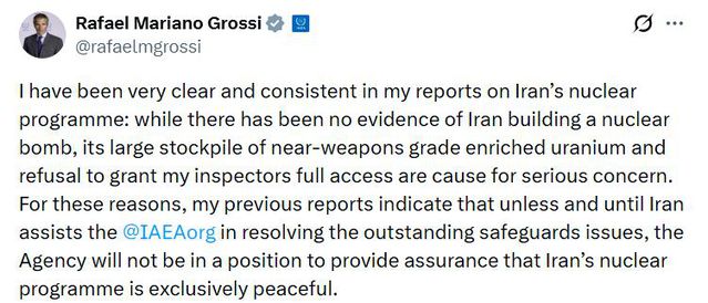 Uluslararası Atom Enerjisi Ajansı (UAEA) Başkanı Rafael Grossi, İran‘ın nükleer bomba ürettiğine dair bir kanıtın bulunmadığını yineleyerek, “Buna rağmen,
