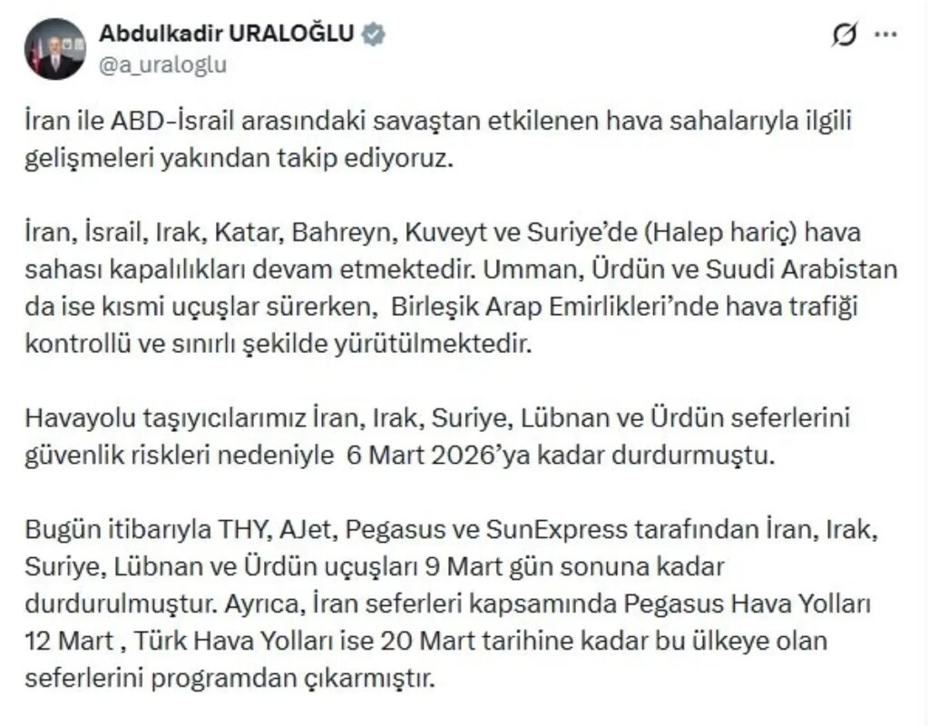 ULAŞTIRMA ve Altyapı Bakanı Abdulkadir Uraloğlu, hava yolu taşıyıcı şirketlerinin İran, Irak, Suriye, Lübnan ve Ürdün uçuşları 9 Mart gün sonuna kadar durdurduğunu açıkladı.